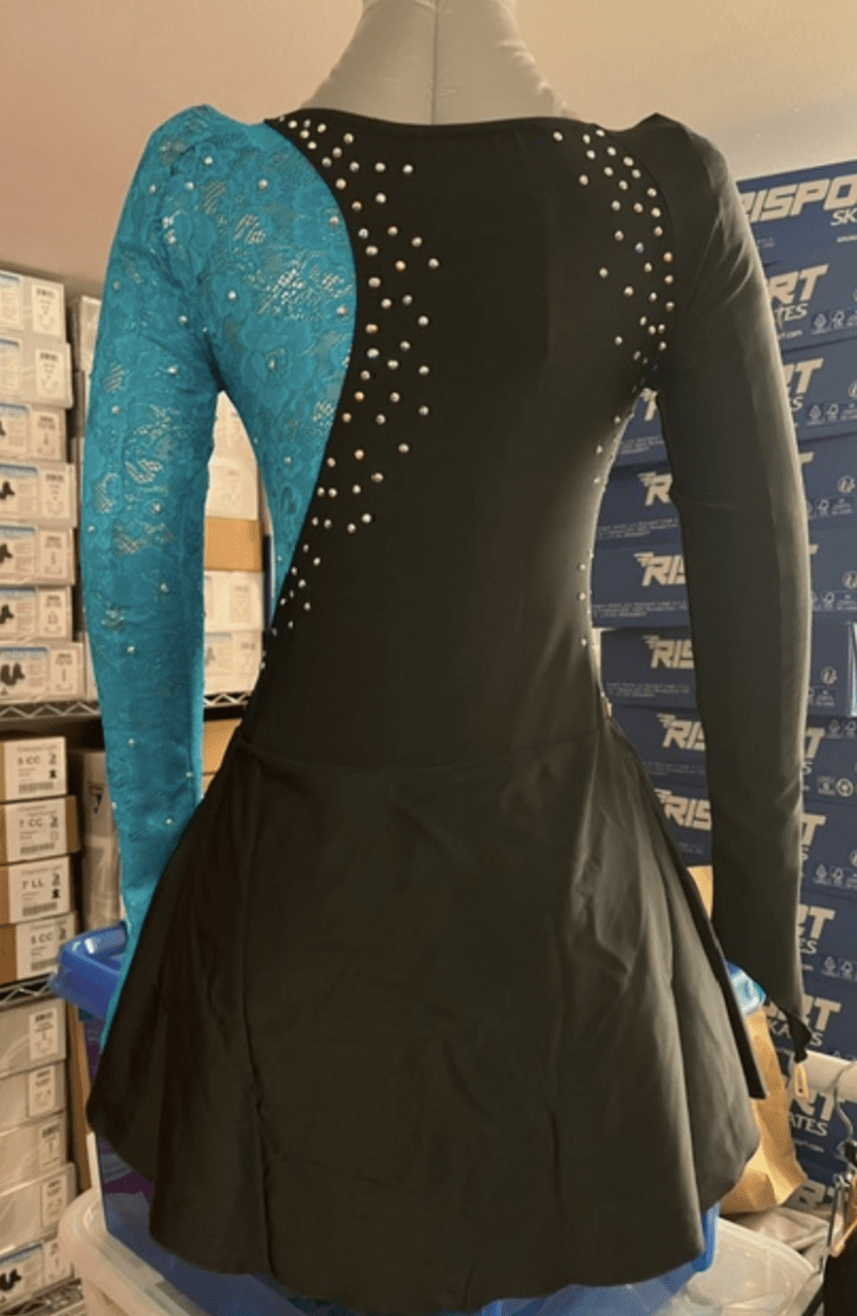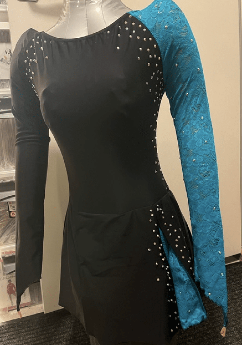 Stunning black dress in lycra with insert and one sleeve in lace, in the colour Versilia (jade). This dress is decorated with 500 AB Swarovski that helps you sprakle on the ice. A matchind scrunchie is included.